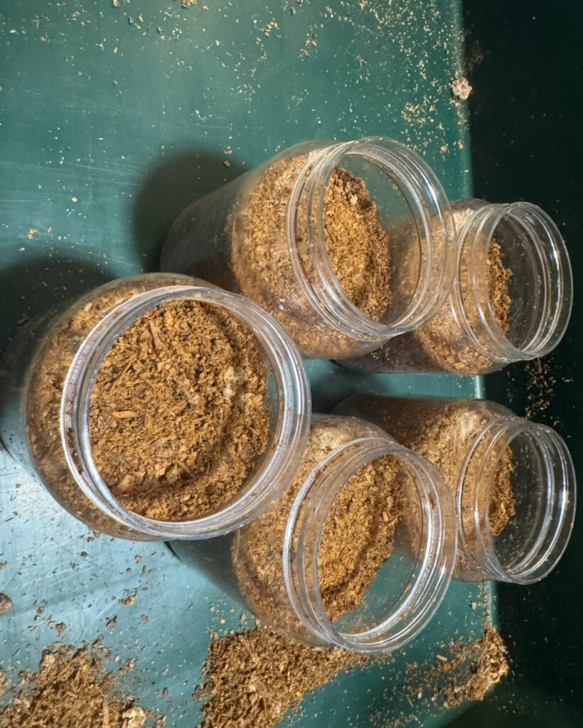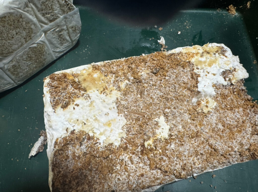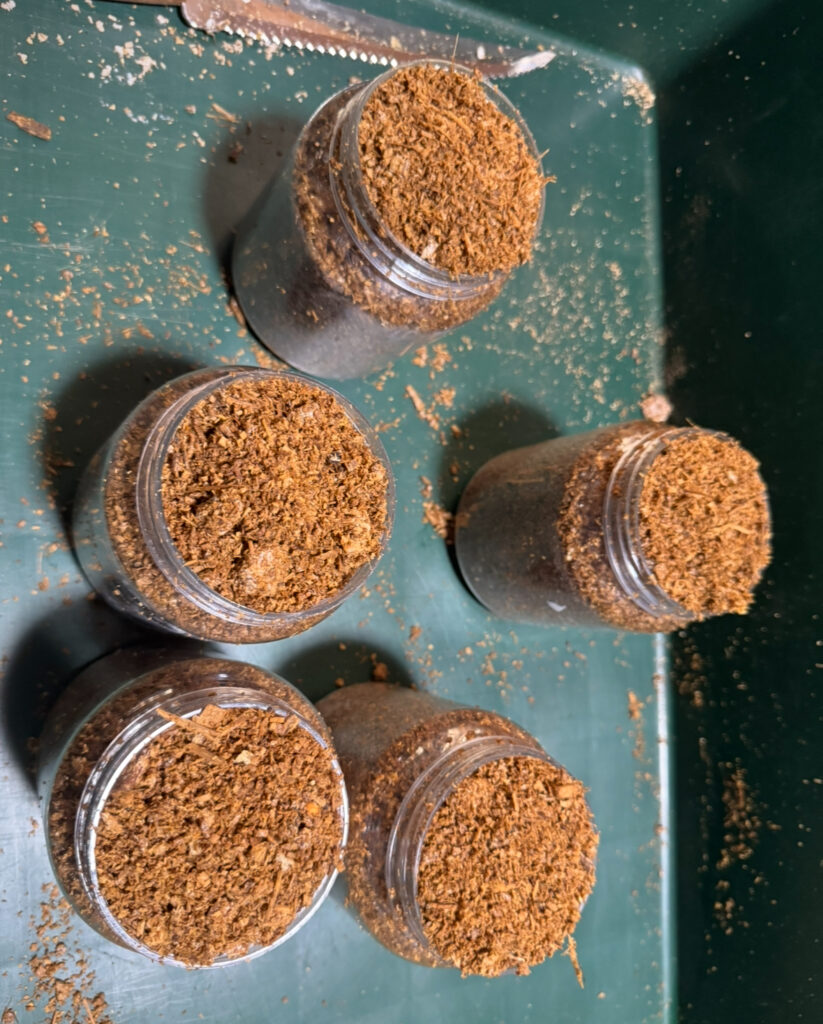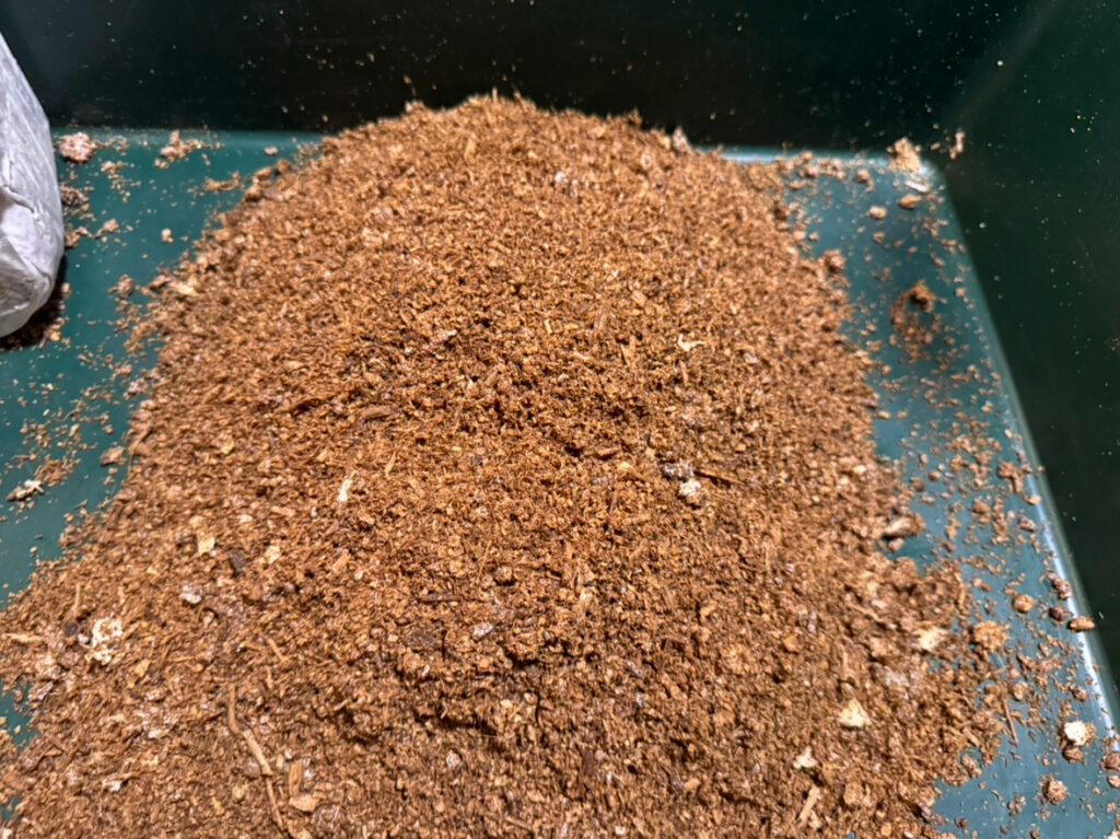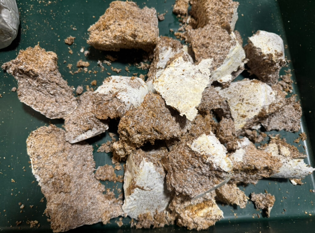 表面は片面だけ取り除いてますw DDAの菌糸は空気穴があるのでそこにも白い部分があるので砕きながら取り除いて、適当なサイズに砕いた後に、押したり擦り合わせたりして、粉々に。